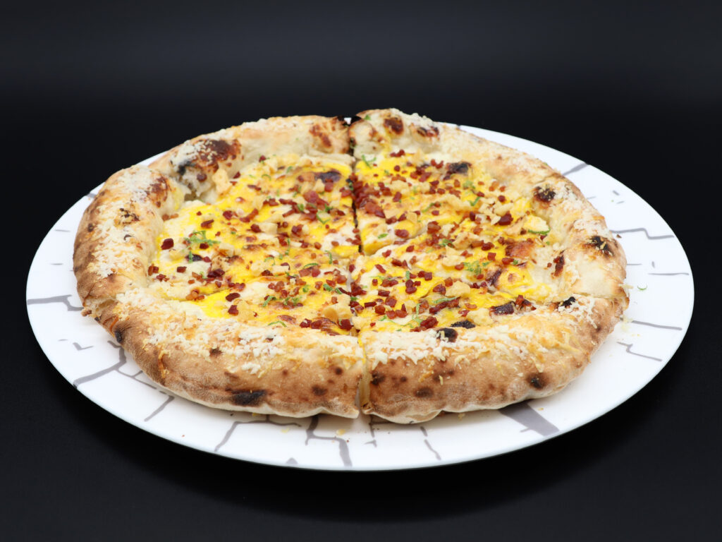 Fonduta di Grana Padano DOP 12 mesi, scamorza affumicata, tuorlo d’uovo pastorizzato, bacon affumicato, pecorino romano sul cornicione, chips di Grana Padano DOP 24 mesi, pepe e Zest di lime