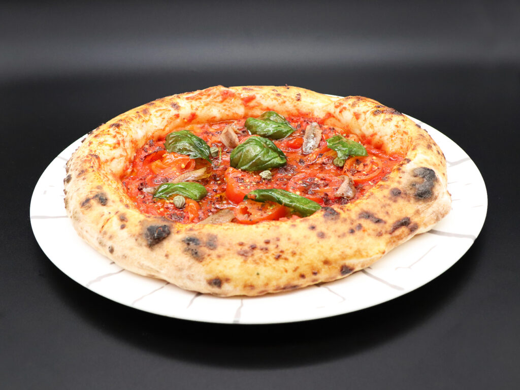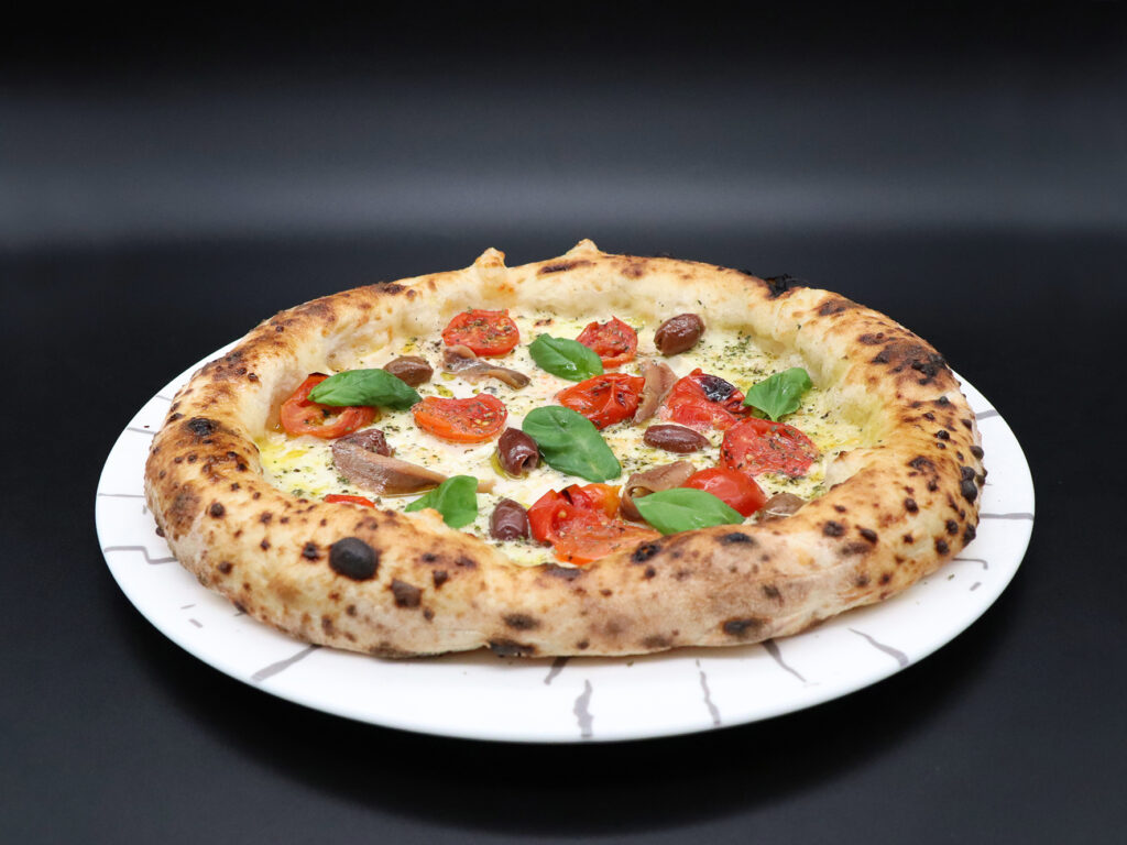 Mozzarella di bufala campana DOP, Fiordilatte, piennolo del Vesuvio DOP, olive nere, filetti di alici Cetarii, origano, basilico, olio evo