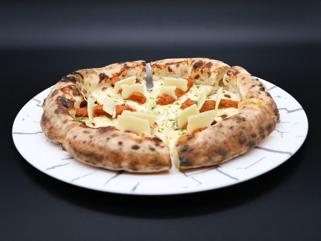 Mozzarella di bufala campana DOP, ricotta di bufala campana DOP, scamorza, salsiccia stagionata di suino casertano, pepe nero, macchiato di pomodoro San Marzano, olio Evo