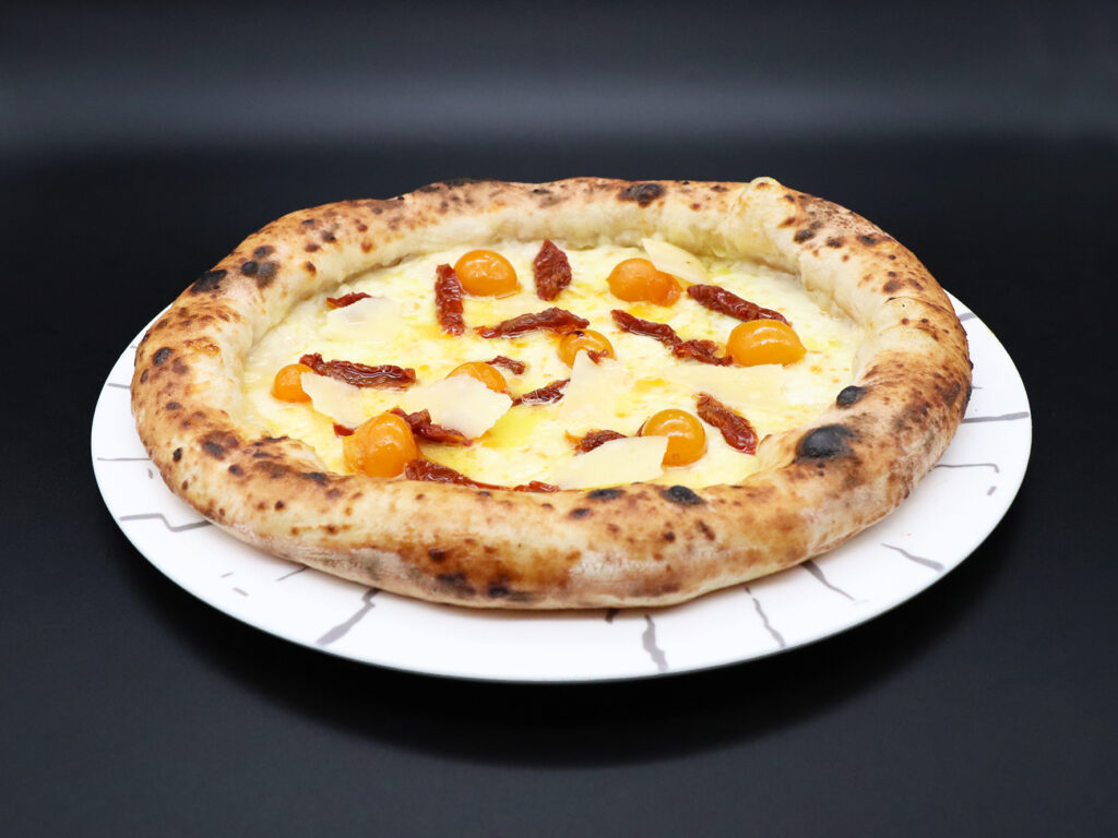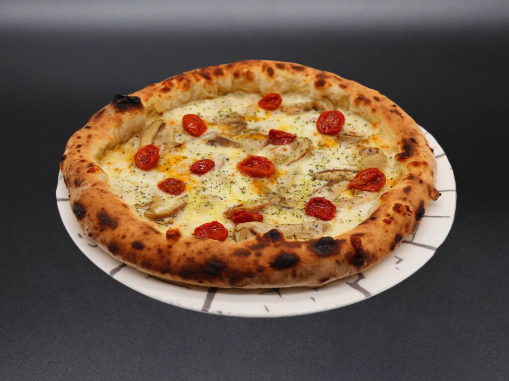 Fiordilatte, formaggio del Matese, pomodori confit, funghi porcini, origano, olio Evo.