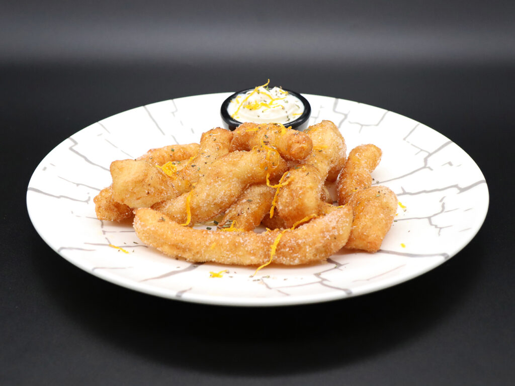 Cono Fritto dolce con Crema Pasticciera, Fiordilatte, Canditi, Nocciole Tostate, zucchero, Cannella e Zest di Arancia