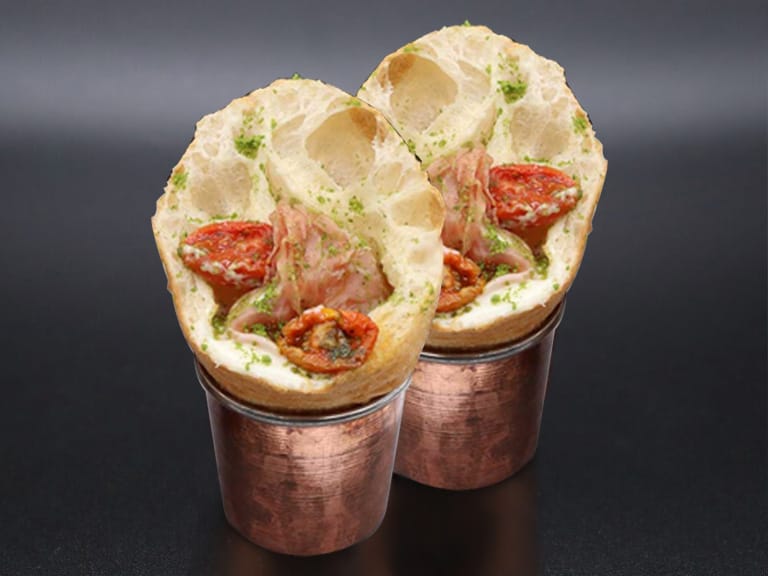 Cono fritto con Fonduta di Grana Padano DOP 12 mesi, Mozzarella di Bufala Campana DOP, Prosciutto Crudo, Pomodorino Confit, Pesto di Basilico liofilizzato