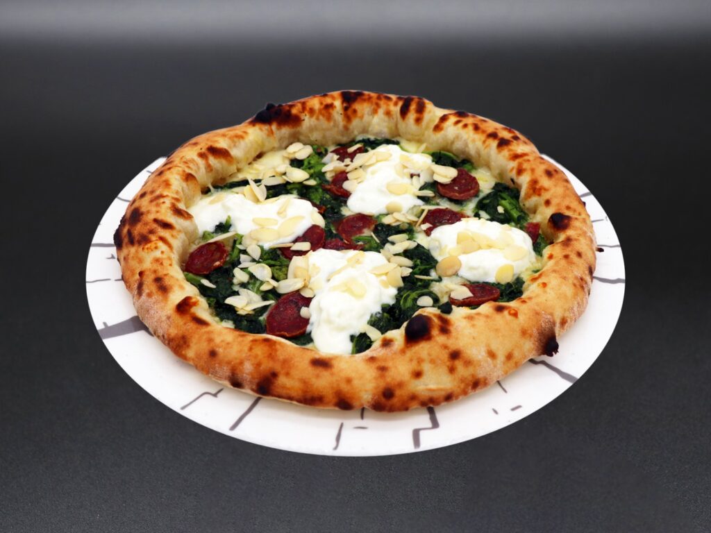 Fiordilatte, salsiccia stagionata di nero casertano, friarielli, peperoncino, stracciata di bufala, mandorle croccanti, aglio, olio Evo